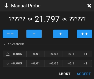 Once the screw is adjusted so that a small amount of friction is felt, run either the ACCEPT or ADJUSTED command. Use the ADJUSTED command if the bed screw needed an adjustment (typically anything more than about 1/8th of a turn of the screw). Use the ACCEPT command if no significant adjustment is necessary. Both commands will cause the tool to proceed to the next screw. (When an ADJUSTED command is used, the tool will schedule an additional cycle of bed screw adjustments; the tool completes successfully when all bed screws are verified to not require any significant adjustments.) One can use the ABORT command to exit the tool early.